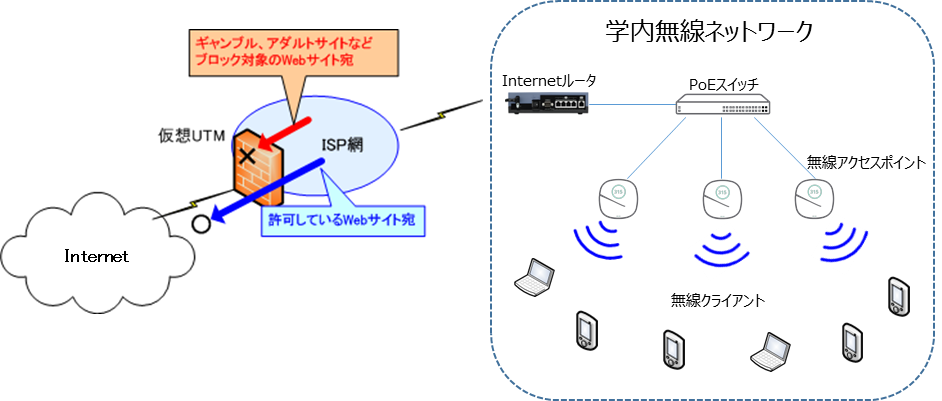 セキュリティ対策としてAruba APの「時間ベースのSSID制御機能」による無線NW自体の利用制限、またISPが提供するクラウド型仮想UTMサービスを利用する事により、コストを抑えつつ適切なセキュリティを実現。